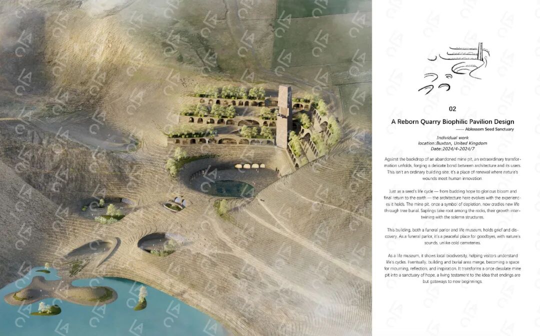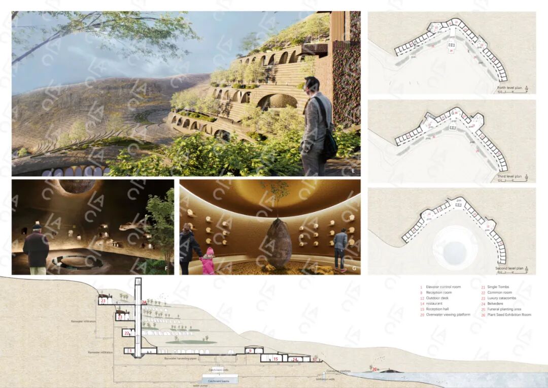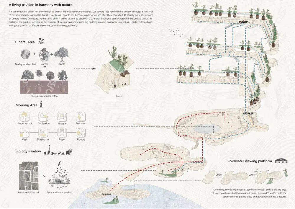 这个建筑会拥有像一粒种子的生存周期--一从萌芽的希望到灿烂的绽放,再到最后的回归--这里的建筑随着时间的变迁而进化。整个设计中主要分为树葬区和生物博物馆区域。跨越了整个矿坑的高度,展示不同高度的风景。其中大圆盘广场和垂直交通的电梯塔塑造出殡仪馆肃静的氛围。其中改变了英国传统的火葬方式,利用场地高差,结合新型绿色殡葬——树葬,不仅可以帮助“地球伤疤”回归森林,还创造出树下独立的更加隐私的悼念空间。