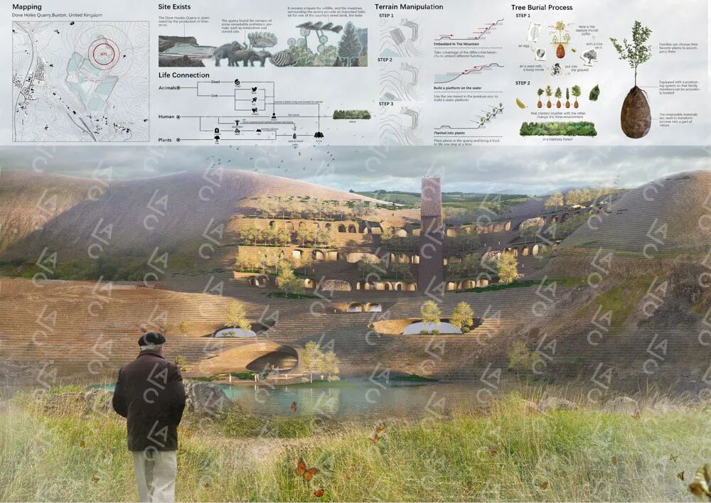矿坑,曾经是枯竭的象征,现在通过树葬孕育了新的生命。小树苗在岩石中生根,它们的生长与庄严的建筑物相互交配。