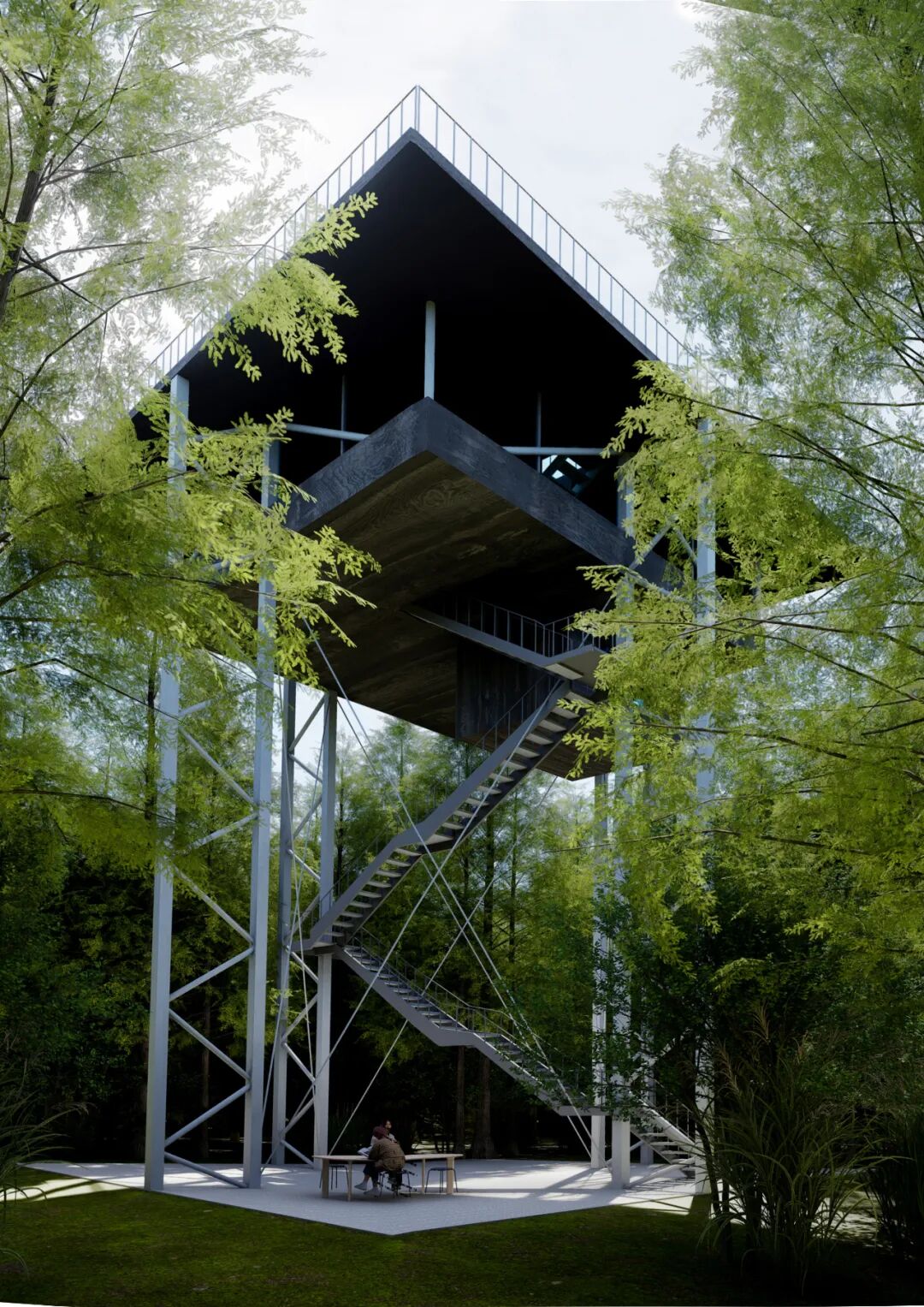 我是一个从小生活在高密度城市里的人,并且我想现在有不少人也是这样的,感受自然对我来说是很吸引我的,我希望能有一座在森林里的屋子,所以我把场地选在了森林,这也是我设计的前提条件。设计的灵感来源于古时候禽兽远多于人类时,有部分原始人是在树上睡觉的。我认为抬高的房子可以给我安全感,也可以避开森林中地面层潜在的危险,同时我也可以看到不同层高的景色,这样的空间体验是我所追求的,这也使得我可以更好地感受自然。