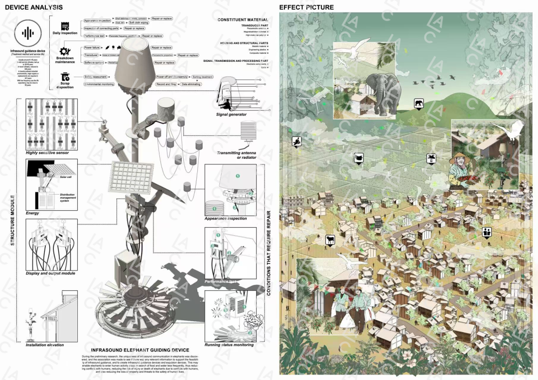 再后来,我分析了大象对整个生态圈的帮助以及油棕种植、生产对生态圈的破坏。在右边,我提出了我的设计策略和策略的推导过程。一个是从人类社会方面尽量的远离去形成保护区;一个是从象群角度,安装一些声纳装置去引导或者传达警告的信号。