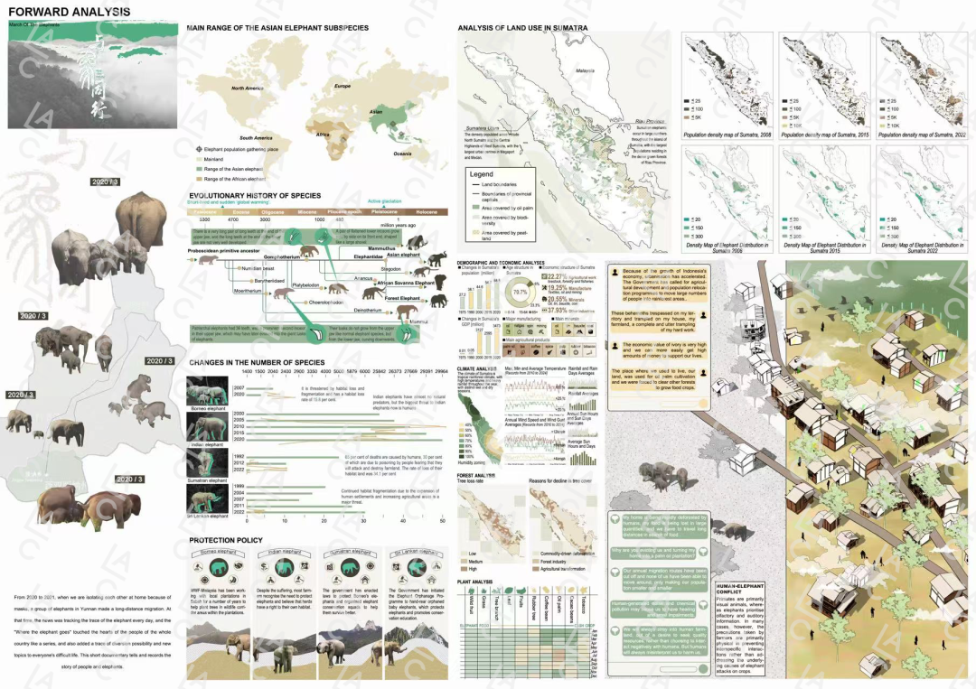 我比较喜欢的是我的第一个项目,它是关于苏门答腊岛的人象矛盾。我的设计更多的是从大象的视角出发。首先,我是通过《March of the elephants》纪录片关注到大象这个群体的,并且好奇世界上其他类型的象群是怎样的处境。于是,我分析了现在大象的世界各地分布的数量情况,大象的进化体系。