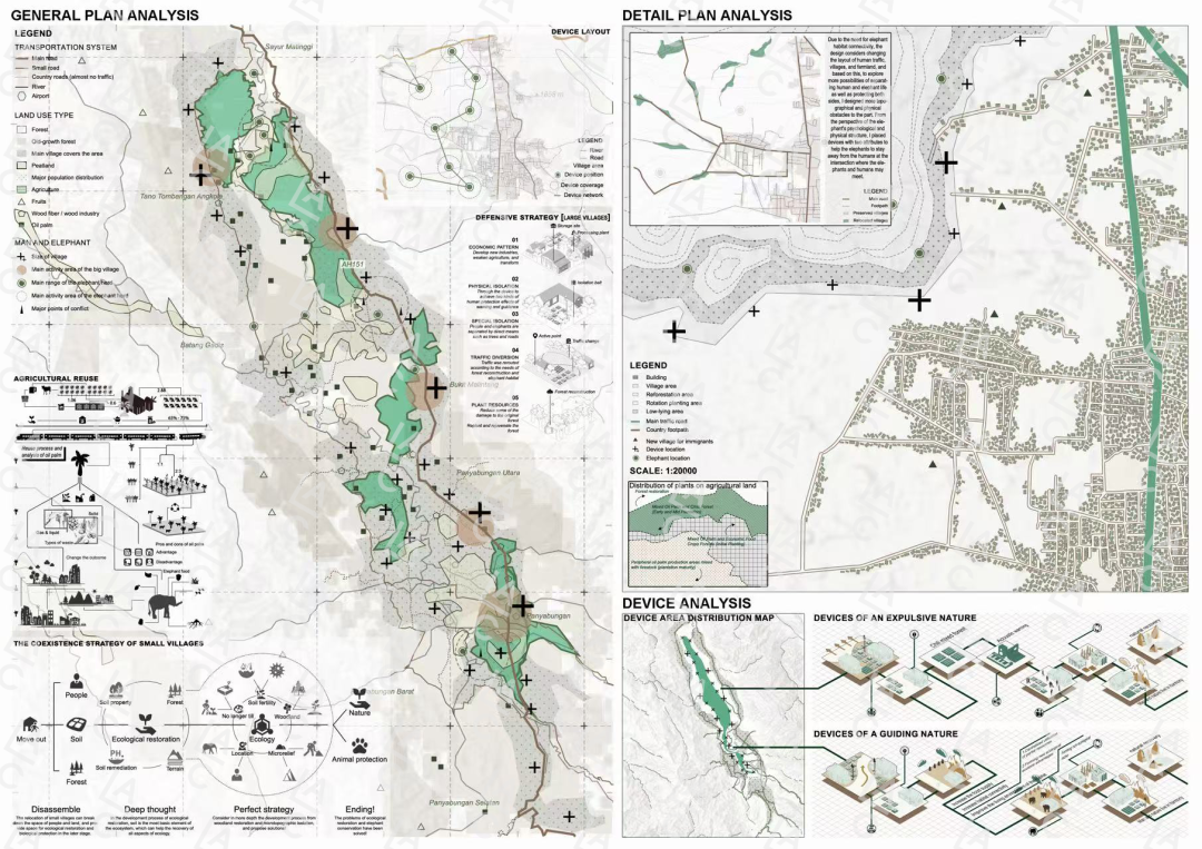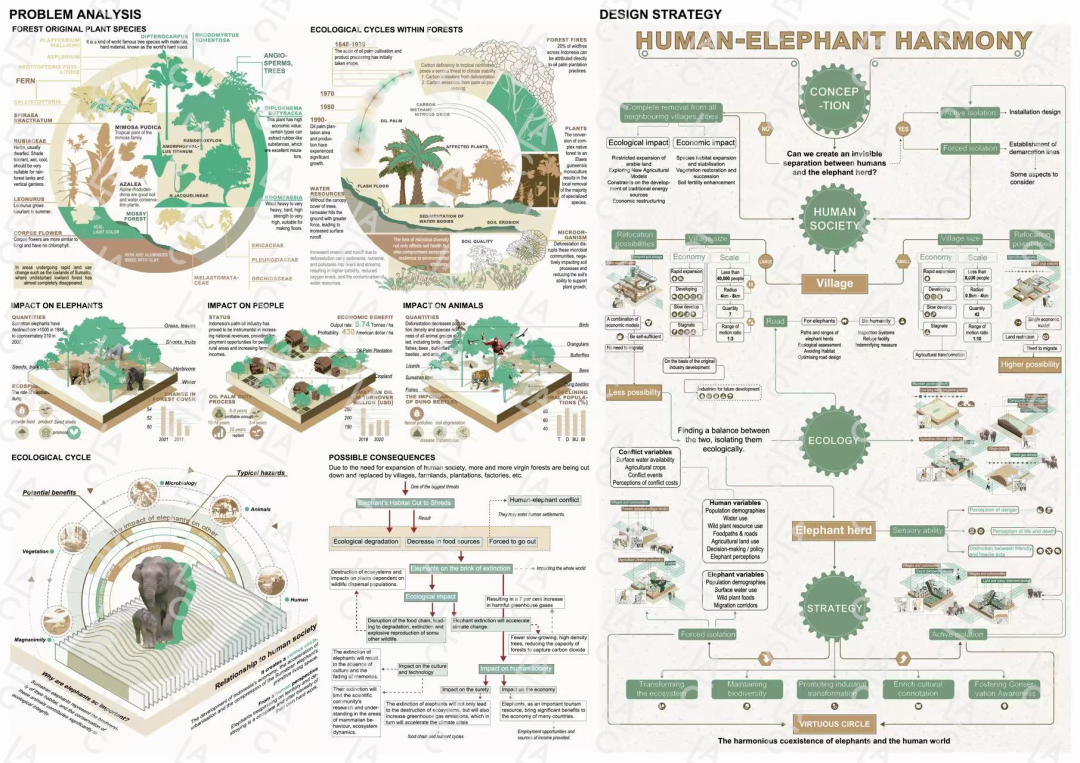 随后,我统计了亚洲象的亚种的数量变化,以及它们相对应的保护政策。得出苏门答腊象处于最濒危的状态的结论。所以,我对比了苏门答腊岛的产业分布变化和象群的栖息地变化,发现,油棕产业的扩张影响了象群的生存。随后我分析了一系列的苏门答腊岛的生态状况来支撑我后期的设计。后我提出人象冲突的核心其实是人类社会的扩张所导致的象群的不适应行为,倘若人类用大象的视角来看待这一类问题,反而会认为自己的行为很粗鲁和过激。