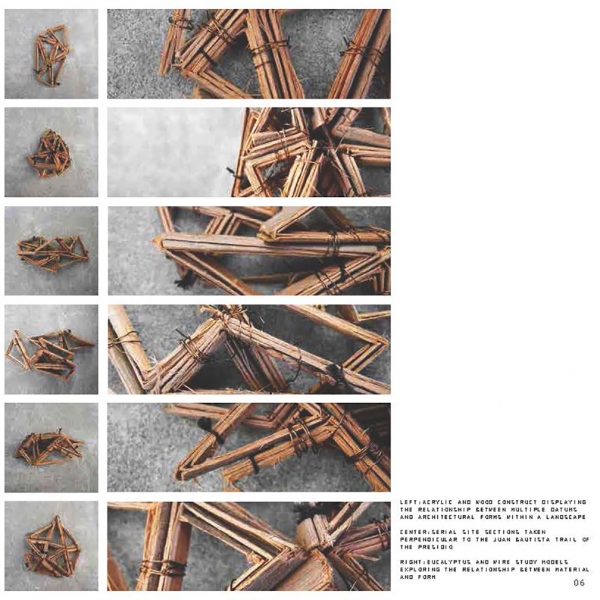 The Museum of Bay Area Figurative Art will consist of six pavilions dedicated to individual Bay Area figurative artists located at sites along a segment of the Juan Bautista de Anza National Historic Trail in the Presidio of San Francisco. Students were required to design one pavilion in detail and a site plan which includes a sequential layout for all six. The concept of visits to the Presdio structured by episodic art works has been successfully tested by sculptor Andy Goldsworthy, whose three installations set in different areas of the park celebrate the Presidio’s reforestation projects while exploring visitors’ interactive relationships with the park’s natural environment and ecosystems, allowing them to experience the familiar in a new way.